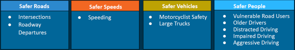 The SAP focuses on ten Emphasis Areas, based on a detailed analysis of crash data and public engagement: intersections, roadway departures, speeding, motorcyclist safety, large trucks, vulnerable road users, older drivers, distracted driving, impaired driving, and aggressive driving. It outlines actions to address crashes in each of these areas.